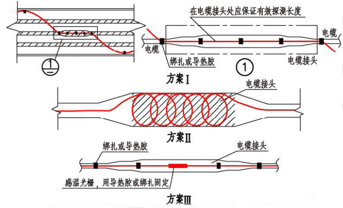 線型感溫火災(zāi)探測(cè)器應(yīng)采用接觸式的敷設(shè)方式對(duì)隧道內(nèi)的所有的動(dòng)力電纜進(jìn)行探測(cè);分布式線型光纖感溫火災(zāi)探測(cè)器在電纜接頭、端子等發(fā)熱部位敷設(shè)時(shí),其感溫光纜的延展長度不應(yīng)少于探測(cè)單元長度的1.5 倍,在電纜接頭處應(yīng)采用方案Ⅱ的方式;光纖光柵線型感溫火災(zāi)探測(cè)器在電纜接頭、端子等發(fā)熱部位應(yīng)設(shè)置感溫光柵單元,應(yīng)才用方案Ⅰ、Ⅲ的方式。如圖6 所示: