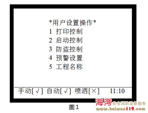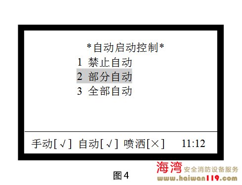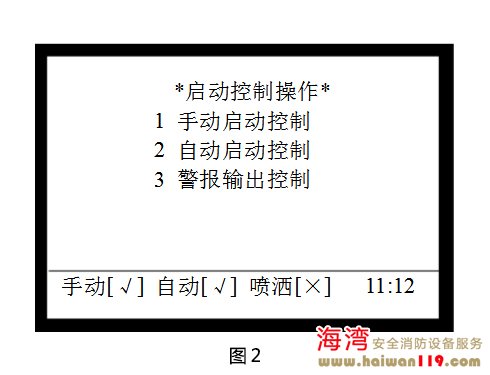 啟動控制設置  在圖1所示界面下,按2進入“啟動控制”界面,調出啟動控制操作菜單,如圖2所示,包含手動啟動控制、自動啟動控制、警報輸出控制的設置,可通過按下其對應的數字鍵進行相關的設置