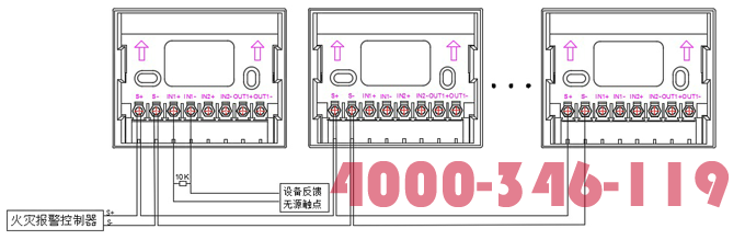 “S+”、”S-”為總線端子,接入火災(zāi)報(bào)警控制器;“IN1+”、“IN1-”接現(xiàn)場(chǎng)設(shè)備無源觸點(diǎn)的常開或常閉開關(guān)量信號(hào),同時(shí)在被控設(shè)備的常開觸點(diǎn)上直接并接一個(gè)10K終端電阻。
